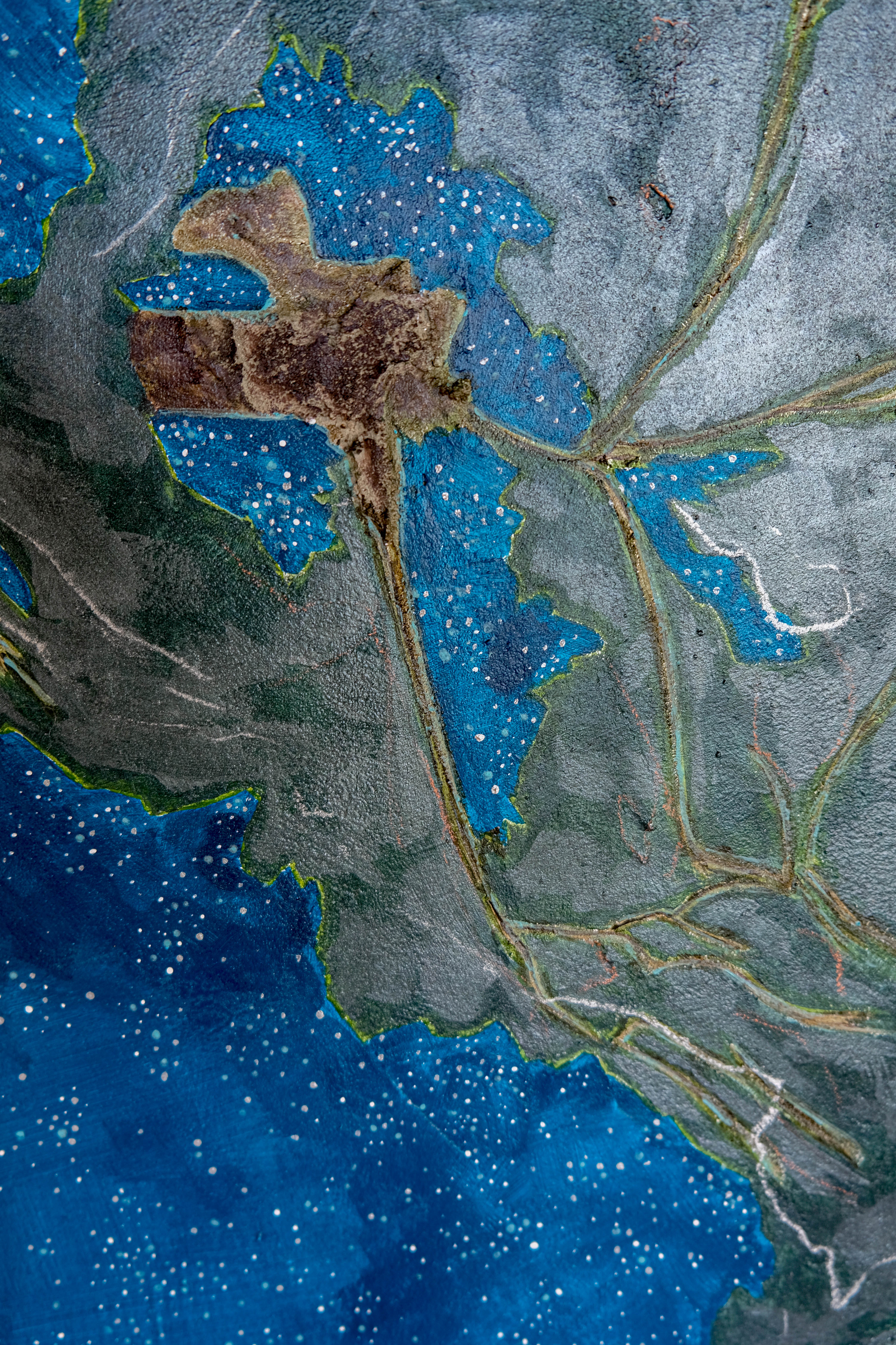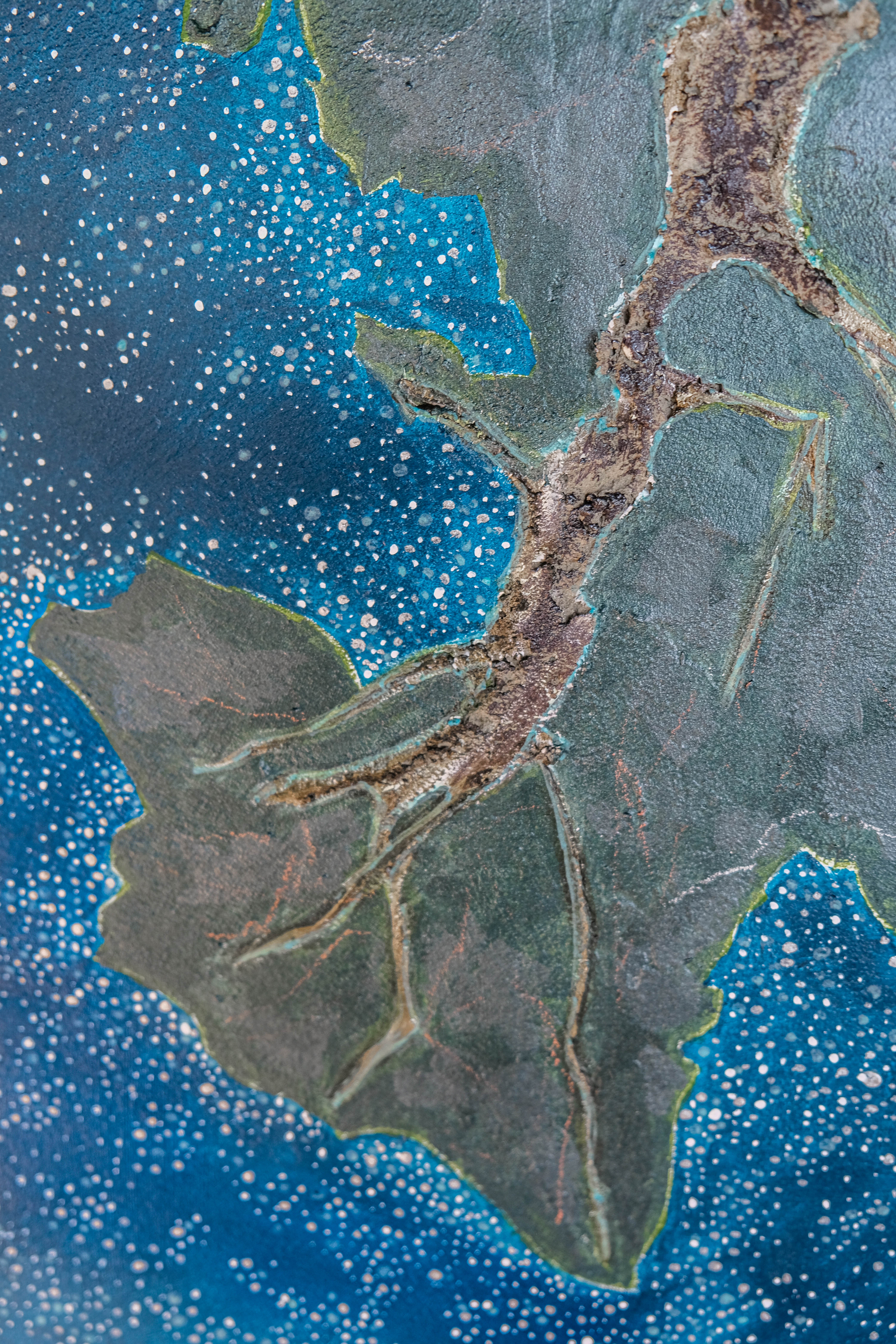 Trees behave differently at night than during the day--their own form of sleeping. During this time they shrink and lower their branches. Scientists are still researching their other functions during sleep. This time is crucial to re-energize, and the scale, glow, and perspective of the painting honors the connection between trees’ sleep and life energy. Light indicates to trees to carry out certain processes such as photosynthesis, so artificial lights of different kinds confuse these innate rhythms. Check out the last images of this painting glowing in the dark!